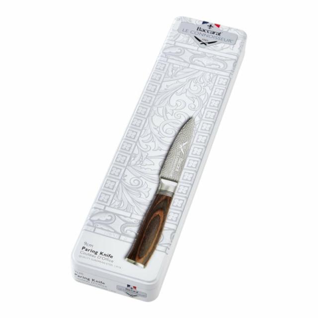 The Baccarat Le Connoisseur Paring Knife 9cm is a ‘must have’ kitchen knife. Perfect for the intricate and everyday culinary tasks of peeling and slicing fresh produce. Its razor sharp blade edge makes for incredible precision and control. An attractive addition to any home kitchen, the Baccarat Le Connoisseur Paring Knife is housed in a vintage inspired tin box which makes a cherished keepsake or a beautiful gift.BRAND CREDENTIALS Baccarat Le Connoisseur knives bring precision and bladesmith perfection to every kitchen. Constructed from superior European Steel 1.4116, mined in Europe since last century, each blade is forged in fire and ice for superior strength and sharpness, delivering exceptional steel blades. Baccarat Le Connoisseur knives feature the hallmarks of all the great European kitchens, so now the choice of renowned master chefs can be yours at home too. Each knife is engineered and tested to meet Rockwell 55 specification guaranteeing the blades hardness and optimum performance. Exclusive to Baccarat Le Connoisseur knives, each blade features a unique cobblestone design that pays homage to French architecture, emanating a vintage feel that also assists with the easy release of food. Durable Pakka wood handles are contoured for a comfortable grip and control, providing effortless cutting, slicing and assists with holding the hand safely away from the blade. Backed by the Baccarat LIFETIME GUARANTEE.Features • The Baccarat Le Connoisseur Paring Knife is our smallest kitchen knife. It has a razor sharp blade that is ideal for everyday culinary tasks of peeling and slicing fresh produce, or intricate work like deveining a shrimp, skinning mushrooms or cutting small garnishes• A unique cobblestone design on each blade that pays homage to French architecture that assists with the easy release of food• European Steel forged in fire and ice for superior strength and sharpness• Rockwell 55 specification for hardness and optimum performance• Pakka wood handles for a contoured grip• Vintage tin box makes a cherished keepsake• Backed by the Baccarat LIFETIME GUARANTEEMaterials German Steel
